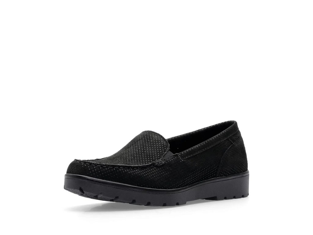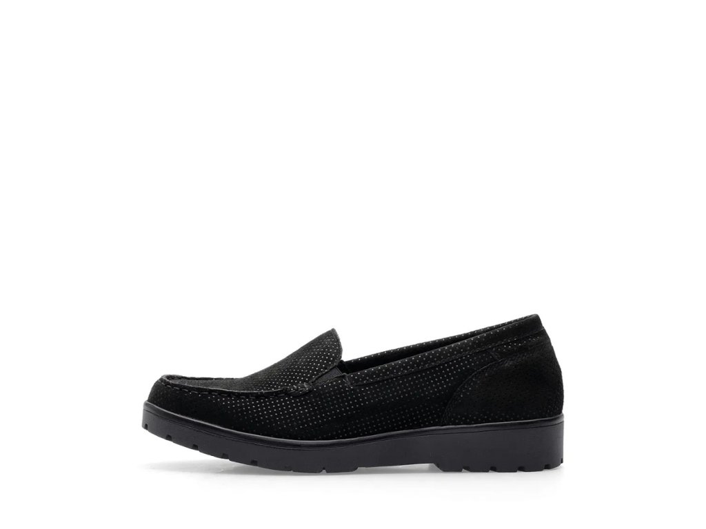 Dámské mokasíny Ara z jemné broušené kůže v univerzální černé barvě představují perfektní spojení komfortu, stylu a kvality. Jejich poddajný semišový svršek se přirozeně přizpůsobí tvaru chodidla a dodává botě elegantní, decentní vzhled. Po obou stranách nártu jsou všité nenápadné pruženky, které usnadní nazouvání a zároveň zajistí optimální přilnavost k noze.
